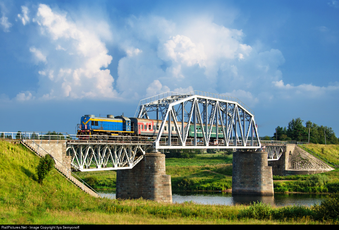 | TEM2 locomotive with suburban train "Tver - Vasylevsky Mokh" at the bridge over the river "Tvertsa" arrives to Doroninskaya station before the storm. Today this train is canceled, like most suburban trains in Tver region. |