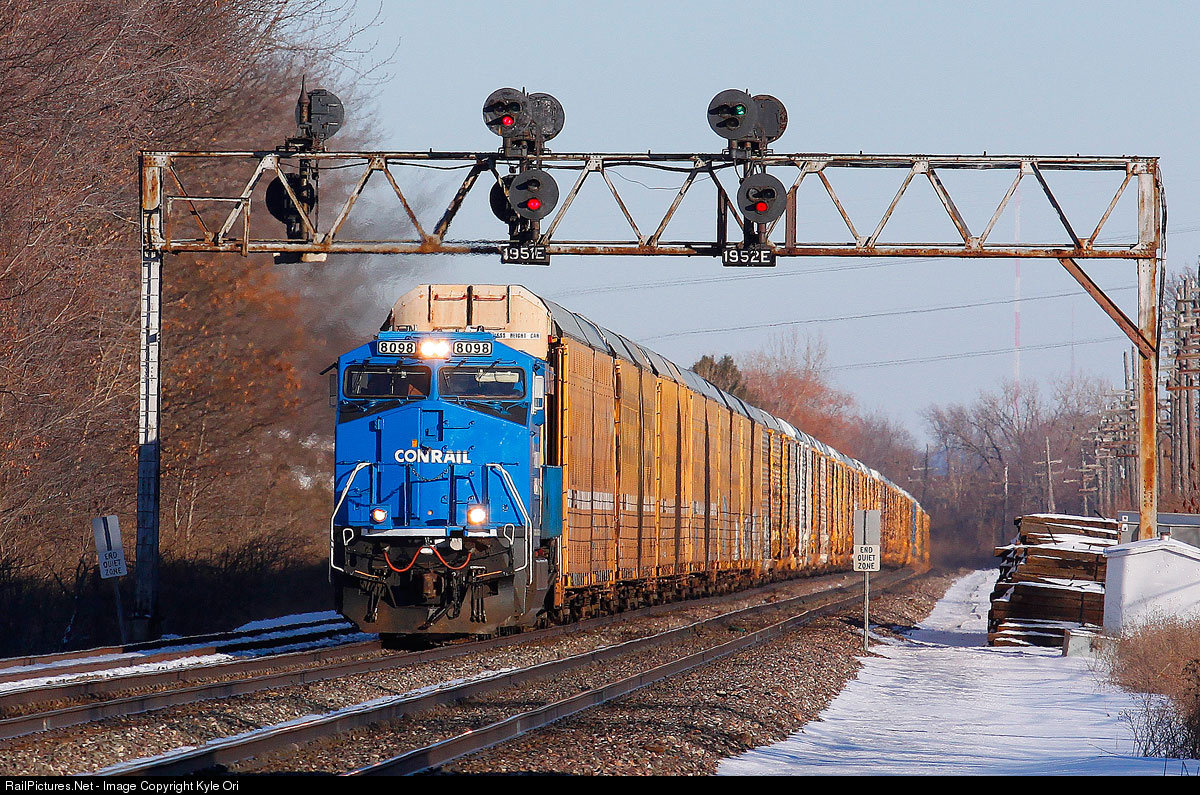 After breaking the band up and setting off both NS 1073 and NS 1011 at Rockport, NS 27N heads for Fairlane Yard with autoracks. 27N is passing underneath one of two ex-NYC signal bridges left on the Chicago line with out replacements next to them.