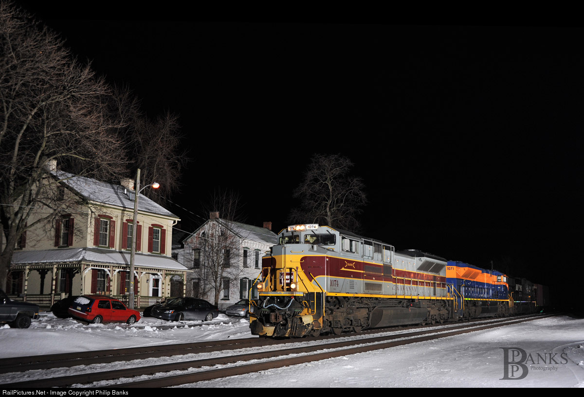 The Duo of the DLW/CNJ plus a standard painted NS makes it's way Eastbound through the town of Lyons, Pa, On May 31, 1998 an F3 tornado made its way Eastward through the town and destroyed several homes only letting a few standing. Luckily these 2 older homes near the mainline survived and allowed for this amazing setting