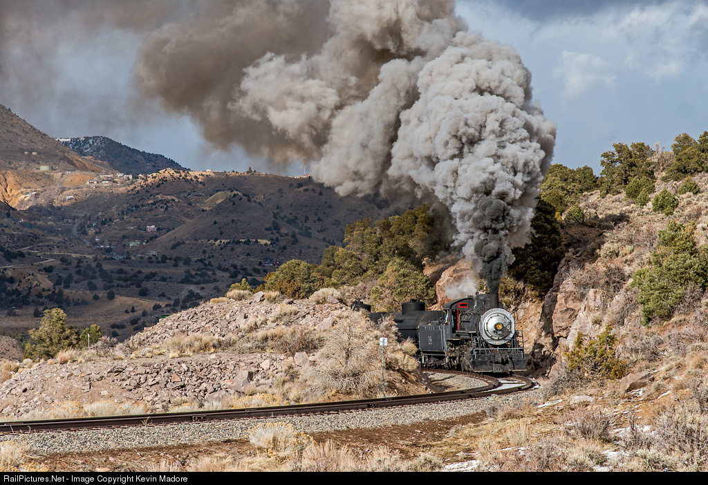 Steamscape: American Flat. Just north of American Flat Tunnel, a V&T Freight passes through a rock cut and begins to traverse the wide, sweeping horseshoe curve at American Flat. Known as the "crookedest shortline in America", the V&T Virginia City Branch follows the contours of the hills as it takes about the most circuitous path possible to reach Gold Hill and Virginia City. On the run from Carson City to Virginia City, it is said that there are enough degrees of curve to make 17 complete circles!!!. That's the old mining town of Gold Hill that you see in the distance on the left. Physically, it is probably less than two miles distant, but the train will travel roughly double that distance getting there, on a steady 2.2% grade doing so.