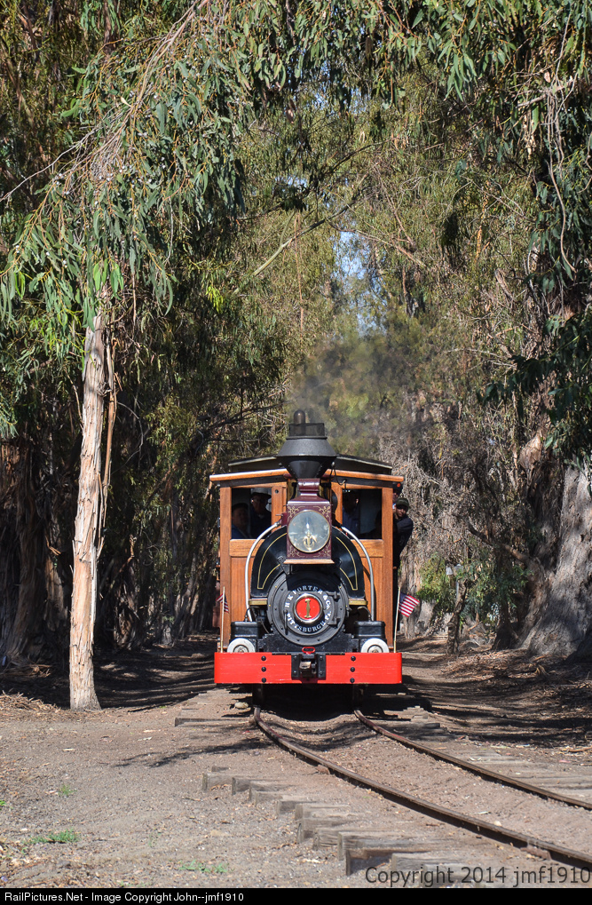 | Antelope Western 1, built in 1889, leads the last train of the day through a tree tunnel back towards the train shed. The Society for the Preservation of Carter Railroad Resources restored this section of track originally built by the Southern Pacific Coast Railroad in the late 1800s. This narrow gauge railroad once stretched from Alameda to Santa Cruz. |