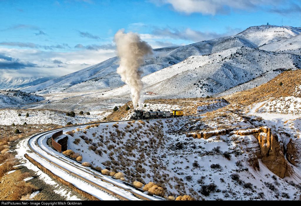 A V&T steam powered freight out of Carson City, NV arrives on the scene early one frigid February morning led by McCloud River Railroad transplant, 2-8-2 #18. Before the train arrives at Gold Hill, a quarter mile ahead, it must first transverse the 300 foot-deep fill bridging an old mining excavation known as Overman Pit. The pit had been dug after the railroad ceased operations but was later filled in the process of restoring the line for tourist operations.