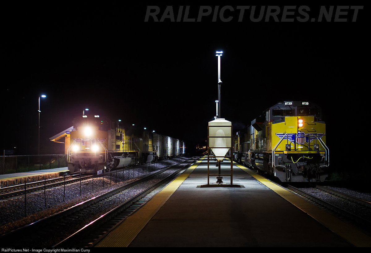 UP 8725 idles on main one as a speedy eastbound manifest passes on main three during a cool, gnat-filled summer night.