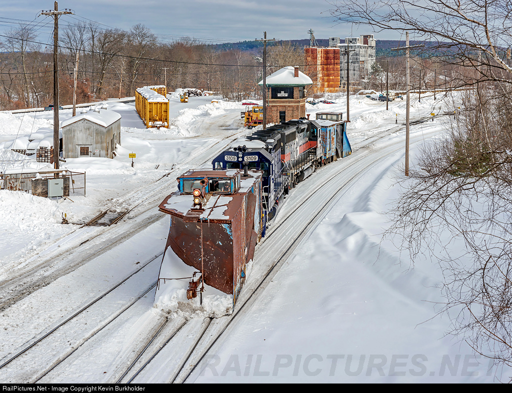 | On February 10, Pan Am Southern Railway dispatched a pair of plow extras out of East Deerfield Yard in Massachusetts. The mainline plow extra with the pair of Boston & Maine double track plows went west to North Adams, Massachusetts, before returning to East Deerfield. The plow extra is departing East Deerfield Yard on the trip west. |