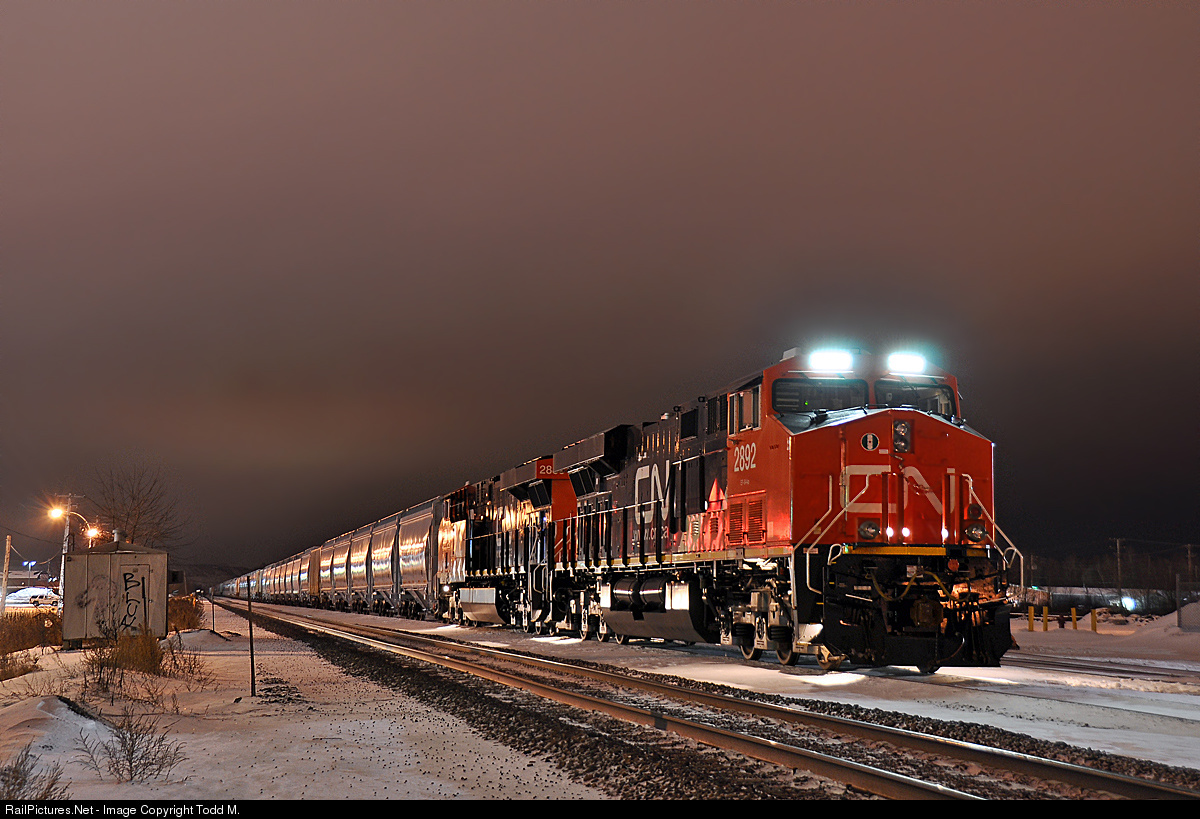 | A quiet night hanging out in the CN Virginia yard with two fresh and clean ES44AC units (2892 and 2886) and new SCYX and NAHX hoppers shining in the night light. Soon the crew will arrive and when traffic is clear, they will proceed north on signals. |