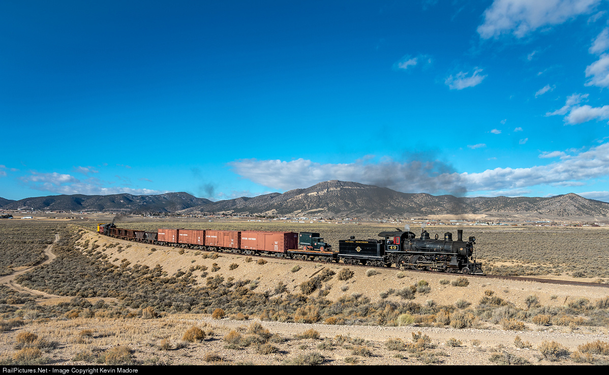 Up the hill to McGill. Leaving Ely behind, a Nevada Northern mixed freight headed by 10-wheeler #40 crosses the big fill at Steptoe Creek, on the way north to McGill. To ensure a smooth trip up the hill, a pusher has been added to the tail end of the consist, with Consolidation #93 doing the honors today. Historical photos appear to show that the original Nevada Northern did indeed operate this way when sending heavy freights up the Hiline, and on the 2015 Winter Photo Shoots, the Nevada Northern Railway Museum was excited at the prospect of being able to re-create this type of train for the cameras. After several years of work, the museum folks have been able to get all of the historic freight cars re-certified for operations out on the main line, and the result was a very impressive train that looked good and sounded great as well.