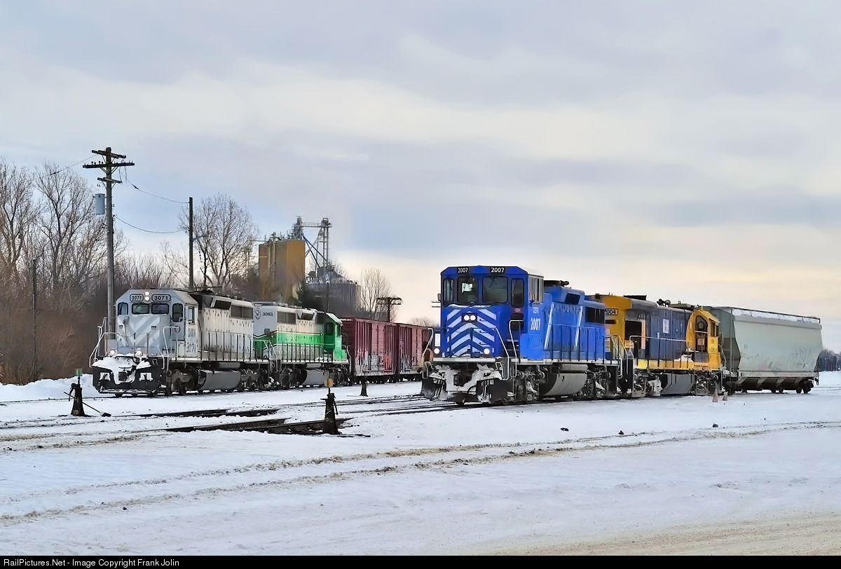 RailPictures.Net Photo: CITX3071 3053 CEFX 2007 CMQ 2004 Central Maine and Quebec Ry, CITX, CEFX EMD SD40-2 GP20D GE B23-7 at Farnham, Quebec, Canada by Frank Jolin