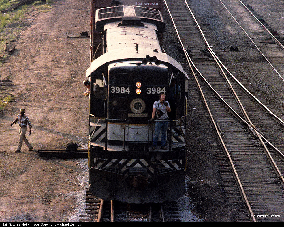 | The Pregnall Turn is arriving at the Southern Seven Mile Yard (named for its milepost location) in North Charleston, SC as the local's conductor expresses his appreciation for the yard conductor having lined the switches for his train's arrival. Many, many things about this photo are uncharacteristic for my style at the time. I basically did not care about the Southern/NS because they were the small player in town and the road trains ran at night. The allure of frequent road trains on the Seaboard System was much stronger, and where I was found 99% of the time. I only took this shot because I was with a friend who was much more into the Southern than me. I'm glad I was along for the ride that day, and pushed outside my normal box. |