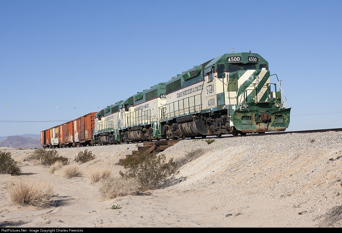 If you wait for this train, you're going to wait a long time. Three former Idaho, Northern & Pacific GP40, since acquired by the moribund (stillborn?) Pacific Imperial Railroad, await their first day of service over a wash bridge in the desert in the Imperial Valley of CA. This train has been sitting here for a year or so already.