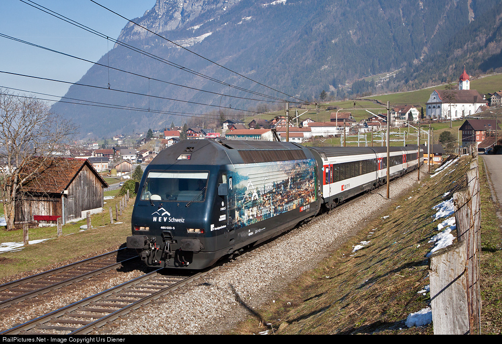 | 460 023 is wearing the commertial paint scheme for the HEV Hauseigentümerverband Schweiz (Swiss house owner union). She is on the way to Locarno with the interregio train IR 2417.