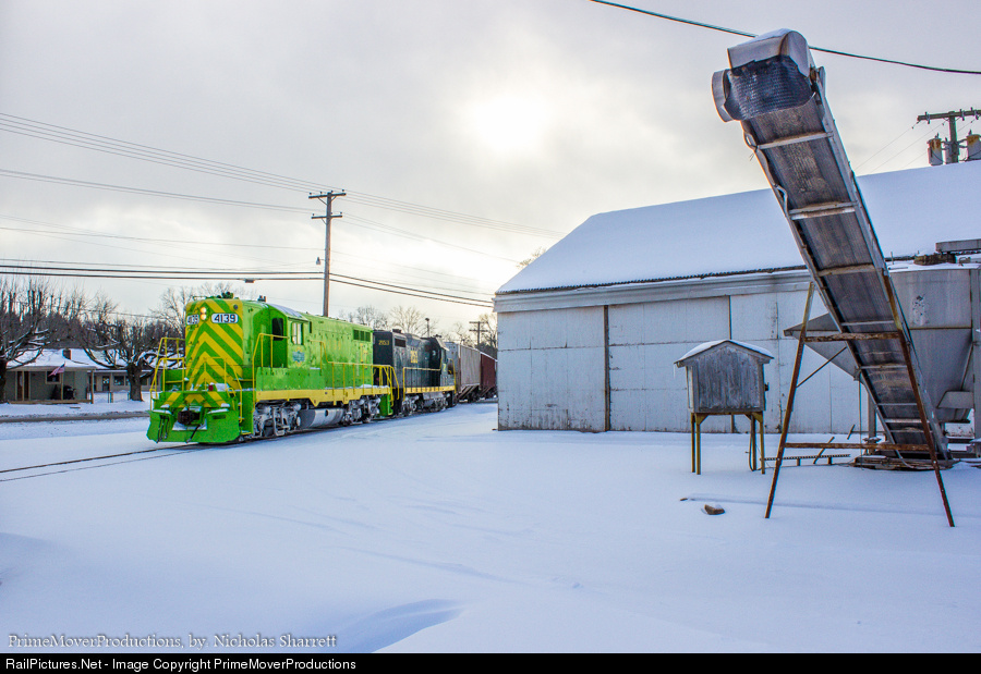 The crew of the Ohio South Central Railroad move slowly through the heart of Jackson, Ohio on their return trip from Aluchem on the cities west side. It was an extremely cold and cloudy afternoon, however the paint of Respondek Rail Corp's Illinois Terminal Painted GP9 stands out on any occasion. The trailing unit is an ex-Santa Fe GP7u that once wore the blue bonnet scheme but now wears the Ohio South Central Green and yellow.