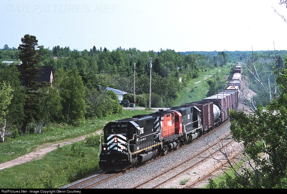 | New Brunswick East Coast train #403 on the return leg of its daily turn from Campbellton to Miramachi rolls through Beresford, under Acadia St. At this time chasing #403 required full use of the speed limit on Highway 11 and only resulted in a few shots between Bathurst and Campbellton. |