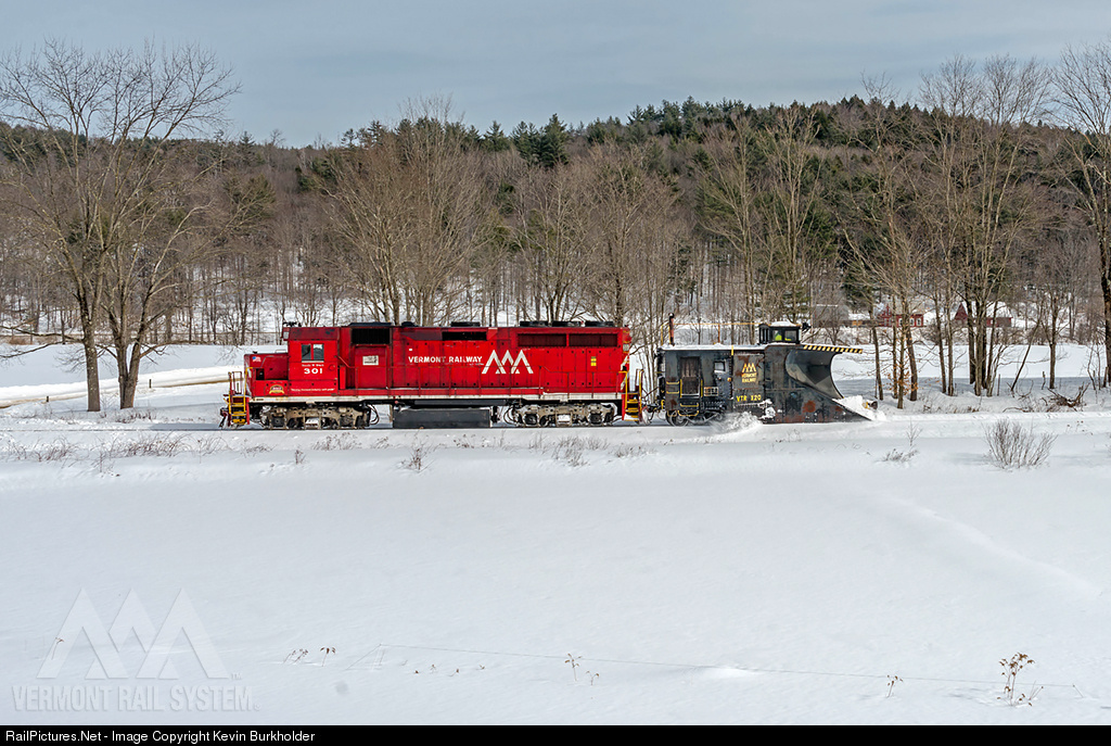 | Ahead of yet another round of expected snowfall for the Green Mountains this weekend, Vermont Rail System dispatched a plow extra to run from Rutland to Bellows Falls to push back banks and make an appropriate walking area for crew should they need to be on the ground and walking alongside a train. The 102-year-old VTR X20 plow was moved by the VTR GP40 301 as it wings back snow at Baileys Mills, Vermont. |