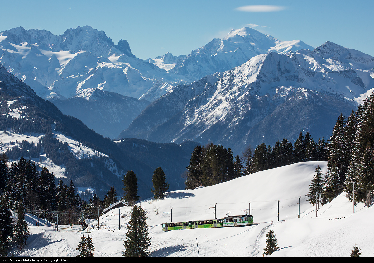 Cogwheel push-pull train of the former Bex-Villars-Bretaye (BVB), now Transports Publiques du Chablais (TPC), near Bretaye, with the highest mountain of the alps, Mont Blanc (4810 meter), in the background. BDeh 4/4 # 81 "Gryon" from 1976 (SWP, SLM, SAAS) with publicity paint scheme for Banque Cantonale Vaudois (BCV), B # 62 and cab car Bt # 64.
