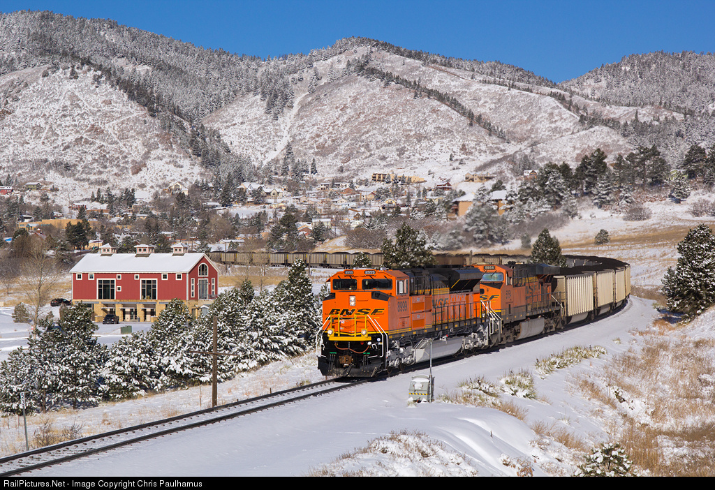 BNSF 8999 leads a string of coal down the grade out of Palmer Lake after a recent blast of fresh snow. A new ACe, fresh snow, blue skies, and mountains...does it get any better?!?