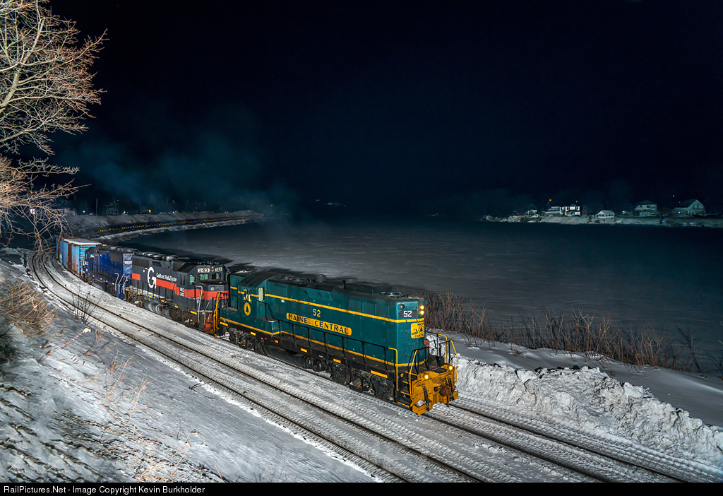 Pan Am Southern's BFED-26 train is seen rolling along the Connecticut River at Bellows Falls, Vermont, with the Maine Central heritage GP9 - ST #52 - leading MEC GP40 343 and GMTX GP40 3109 - as the train takes two B&M boxcar buffers and 55 empty LPG tanks from the VRS Riverside Yard to the connection with the NECR, where PAS exercises trackage rights to East Northfield, Massachusetts and rejoins the PAS Connecticut River Line. Walpole, NH is visible on the opposite side of the river in the photo.