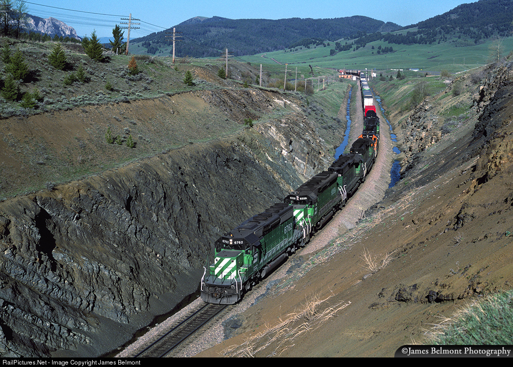 | A four unit manned point helper leads a hot Burlington Northern intermodal train east at West End, Montana on May 26, 1986. The helper set was added to the train at Bozeman and will be cut off at Muir on the east side of the Bozeman Tunnel. |