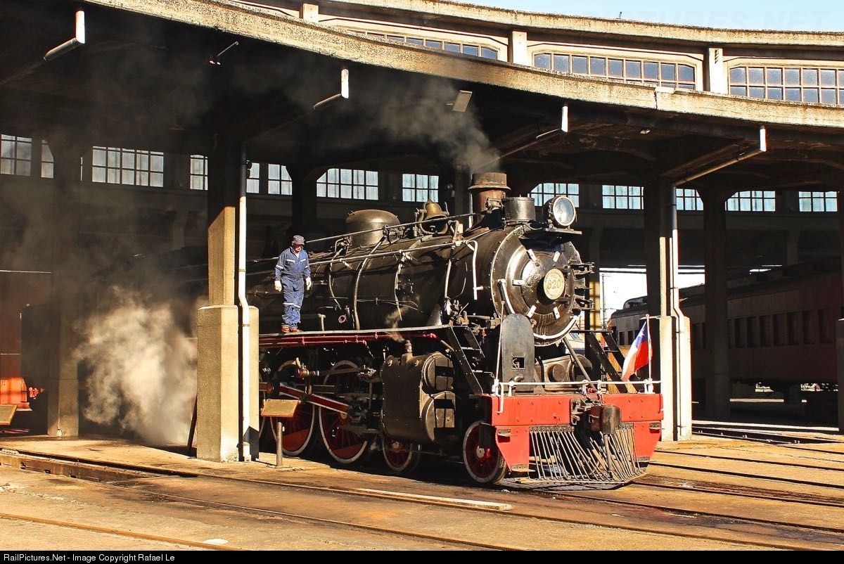 After of a new day of trip, the locomotive Baldwin 820, "Mountain" built in 1940 by Baldwin Locomotive Works, (4-8-2) is the stored in the House of Machines of Museum Railway Pablo Neruda, where one of the operators of train Araucanía, Mr. Francisco Pedreros, makes the latest revisions of the afternoon.