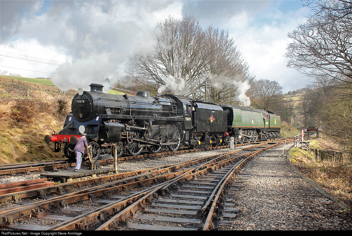 Recently returned to traffic at the Worth Valley after lengthy overhauls are a BR 'Standard 4' class 4-6-0 and an ex-Southern Railway 'West Country' class Pacific. This makes the perfect combination for recreating the famed 'Pines Express' that back in the 1950s and 1960s once ran on the sadly lamented Somerset and Dorset route. 75078 and 34092 'City of Wells' have just arrived at Oxenhope with just such a recreation and a fine sight they make as they run forward to couple up and return their train to Keighley.