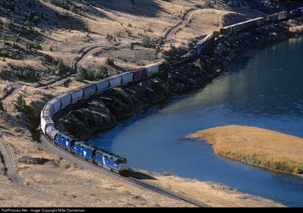 All three of Montana Rail Link’s EMD F45s (a fourth one, No. 392, was on affiliate I&M Rail Link at the time) power LM through Lombard Canyon east of Toston, Montana, on the morning of October 15, 2000. It was rare to get a solid set of cowls on a train, and these were even in numerical order; MRL Nos. 390, 391 and 392.