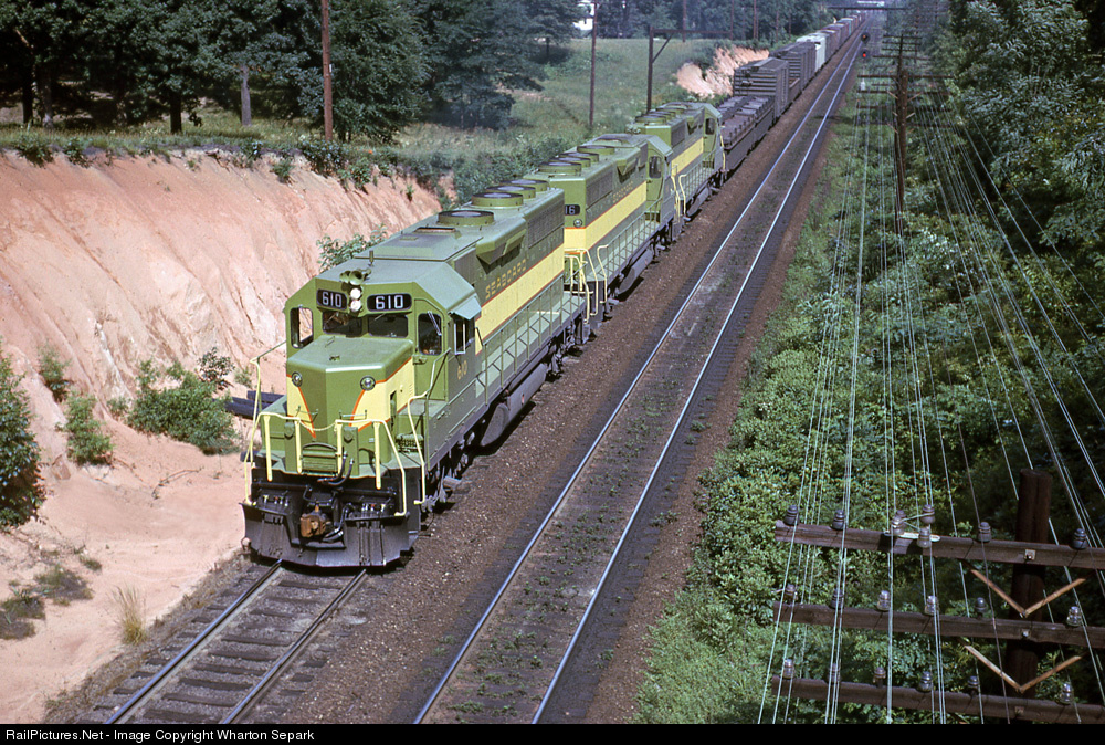 Seaboard time freight No. 75 is working through the NCSU campus in Raleigh, NC in June 1966. Only one month has passed since this trio of GP40's were delivered from EMD sporting this new paint scheme, which was a major re-styling for Seaboard. The new locomotives, which eventually totaled 51, were well received by the crews and were quickly given the nickname "Jolly Green Giants" by the employees.