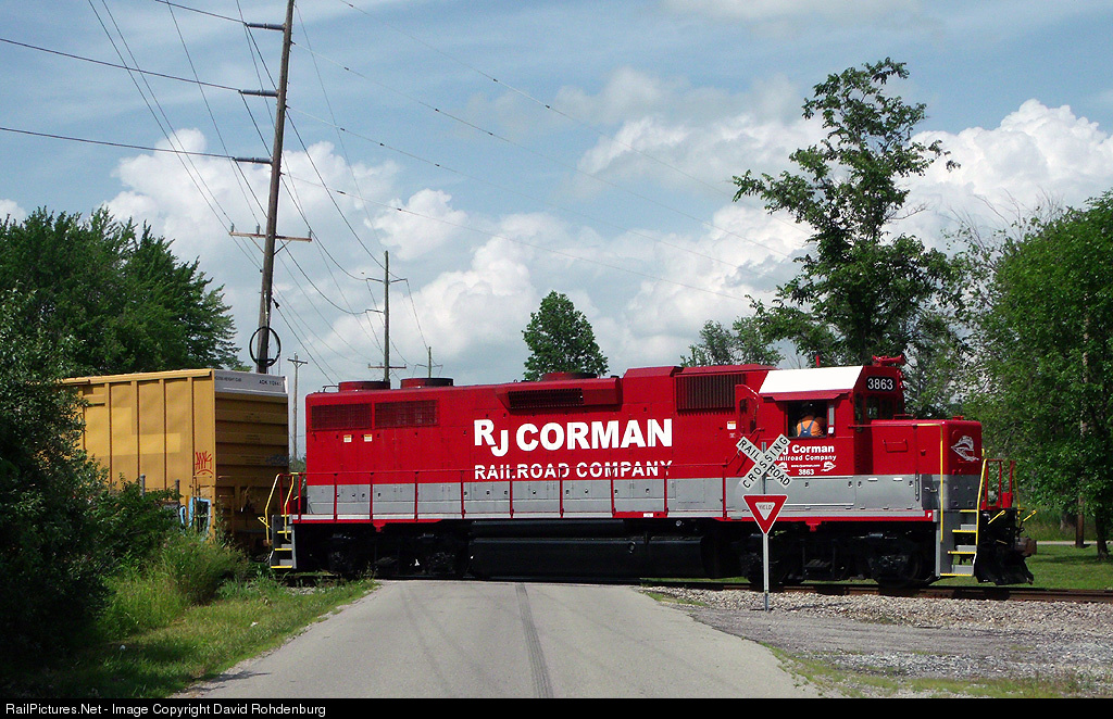 | Before their own power was roadworthy, the Cincinnati East Terminal leased RJ Corman GP38 #3863 for their first couple of months of operations on the old N&W Peavine. Here we see RJCC 3863 crossing Curliss Lane, shoving boxcars into the plant area on the Huhtamaki Spur in Batavia. |