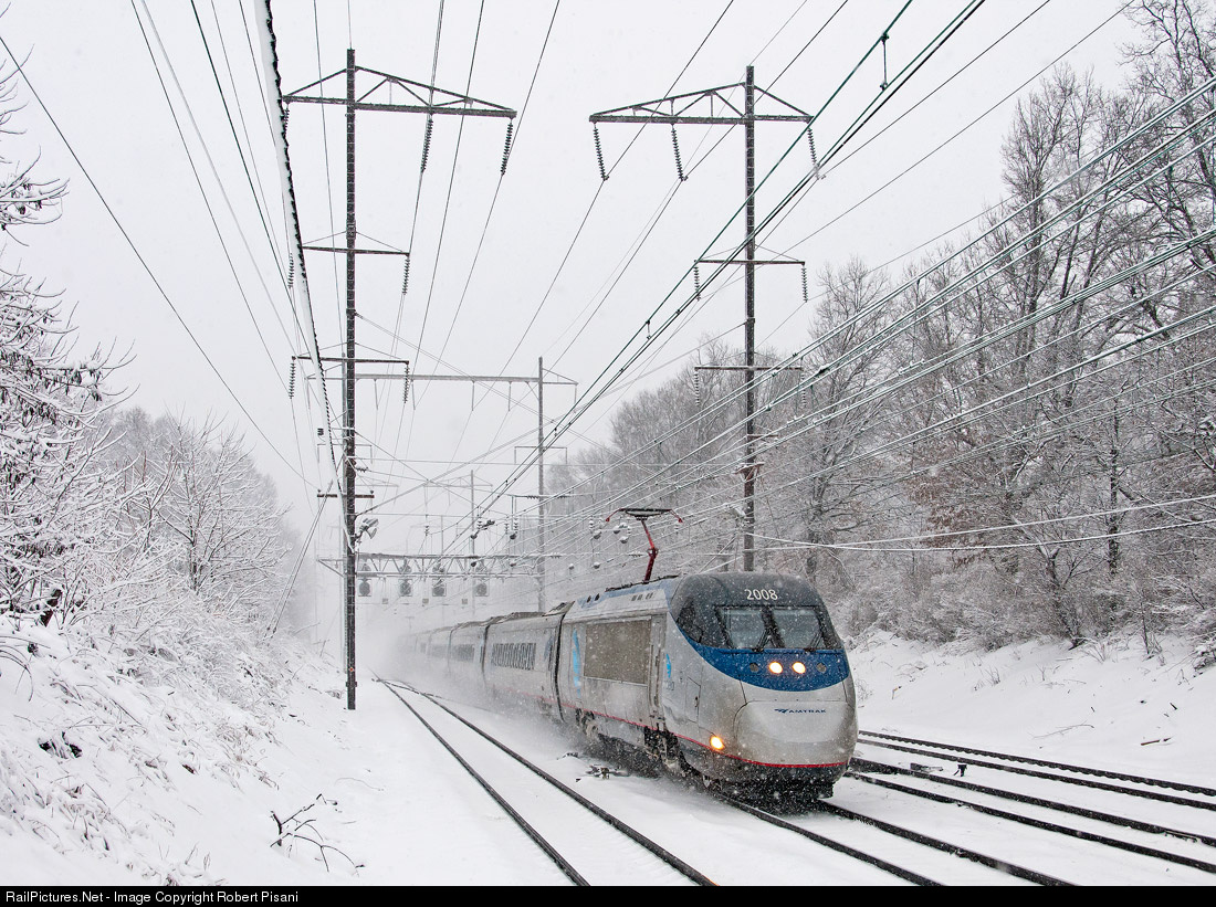 It seems to just keep snowing in the Northeast this winter. This latest storm began in the early morning hours and it would proceed to snow continually throughout the day. There were some service disruptions and delays on the Northeast Corridor, as would be expected. This Acela is running about 20 minutes late as it passes through a snow white Metuchen. |