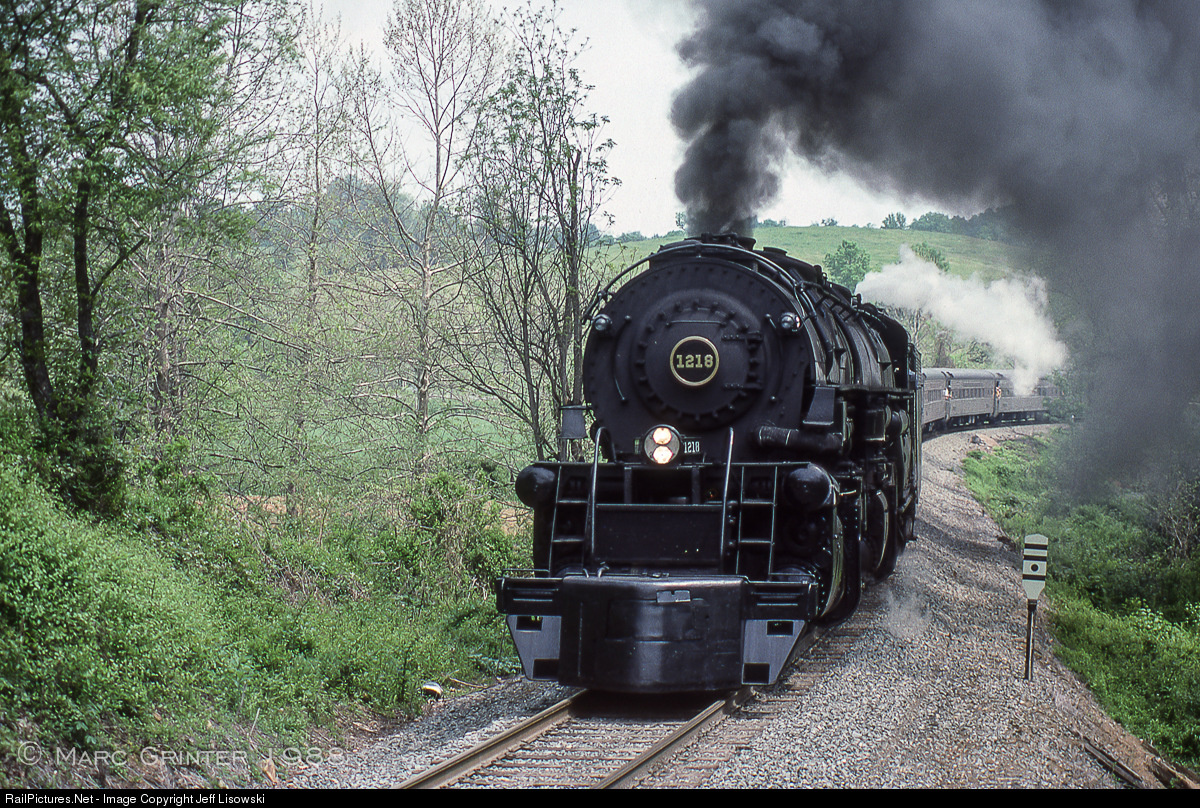Photographer- Marc Grinter- from a 35 mm Kodachrome slide. Former N&W Class "A" #1218 makes easy work of an excursion train through Delaplane, Virginia on a late spring day on a round trip to Front Royal on the Norfolk Southern "B-Line" originating in Alexandria, VA. This was my first and only trip behind the 'Mercedes of Steam,' and she was impressive!