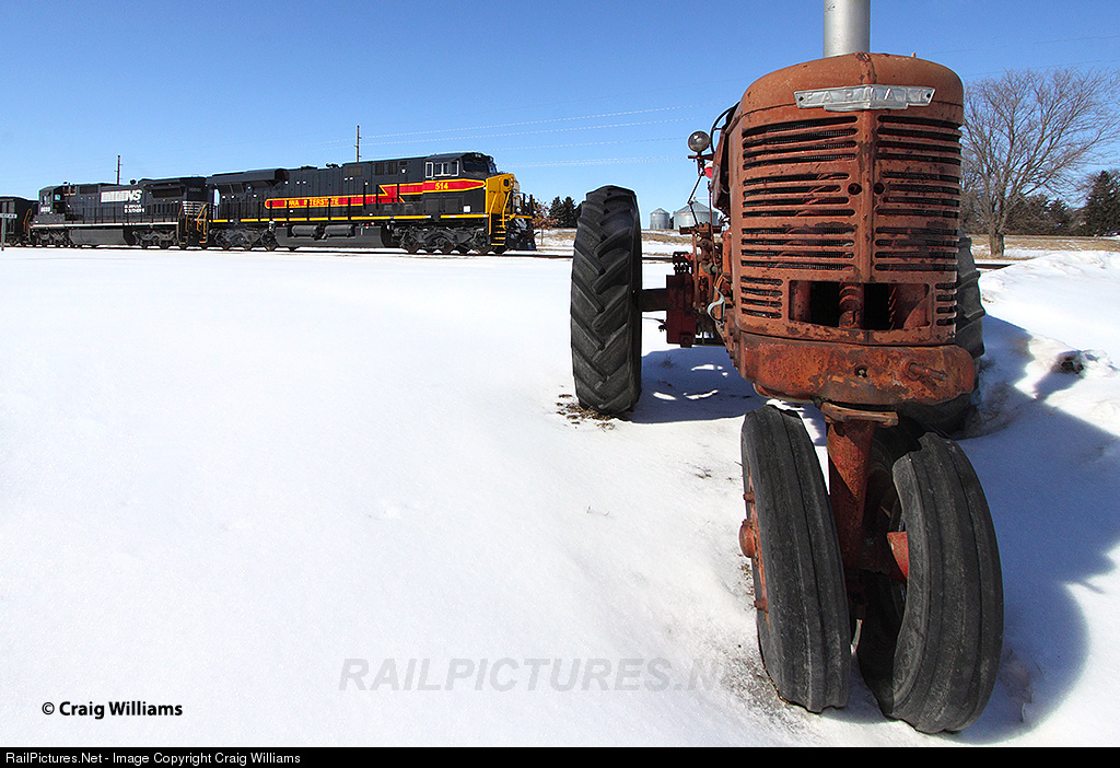 The Peoria, IL, to Cedar Rapids, IA, coal train brakes heavy as they drop down grade off Walford Hill into Yard Limits at MP 9. This train has 96 NS coal car bound for ADM in Cedar Rapids. Seen here at Fairfax passing this old tractor used by the Coop.