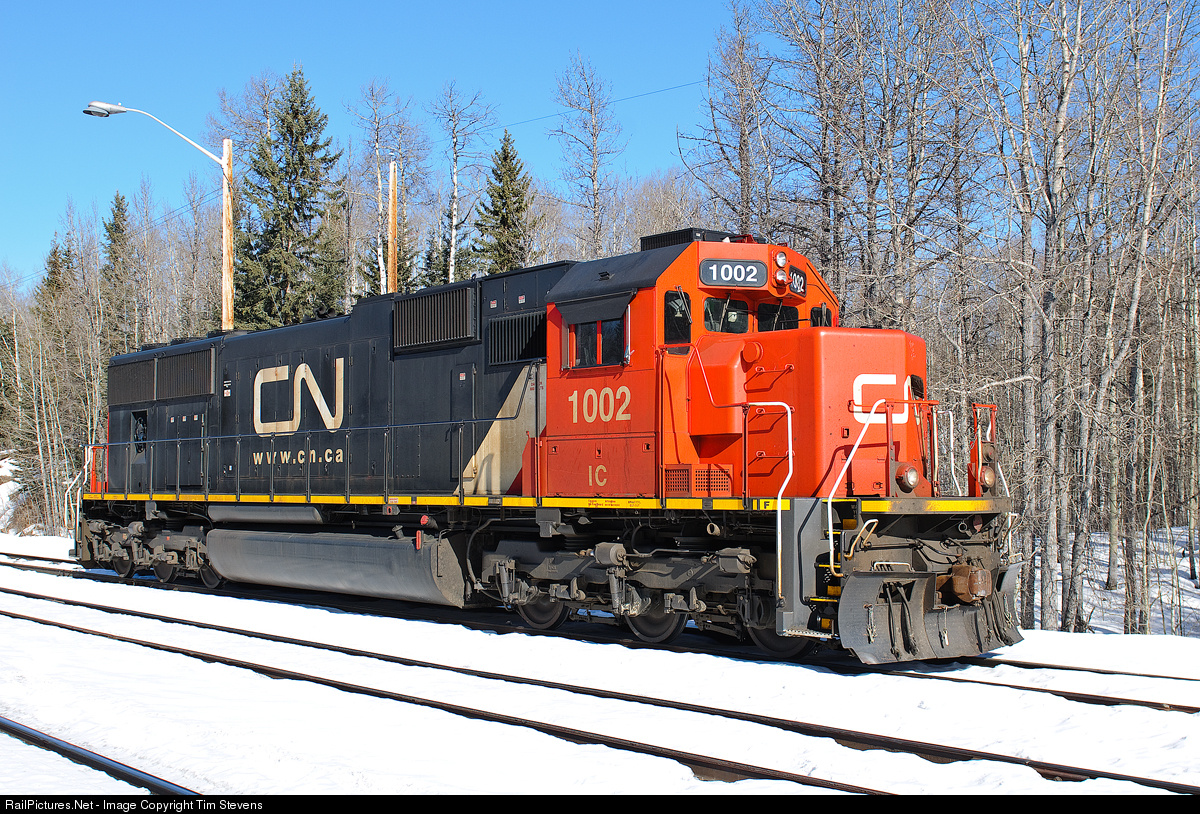 | Being used as float power between Holloway and Cadomin on rock trains U724/U725, IC SD70 1002 idles at the east end of Holloway. A handful of the IC SD70 fleet have been repainted into CN colours, #1002 being one of them. |