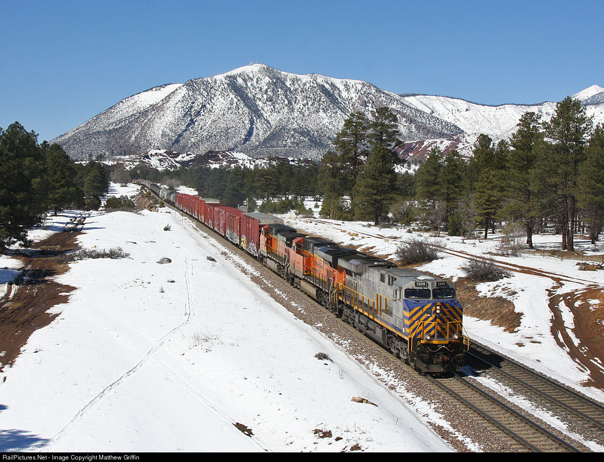 CREX lease power leads this Barstow to Kansas City freight just east of Flagstaff. Recent snow fall made for some interesting photos around the area.