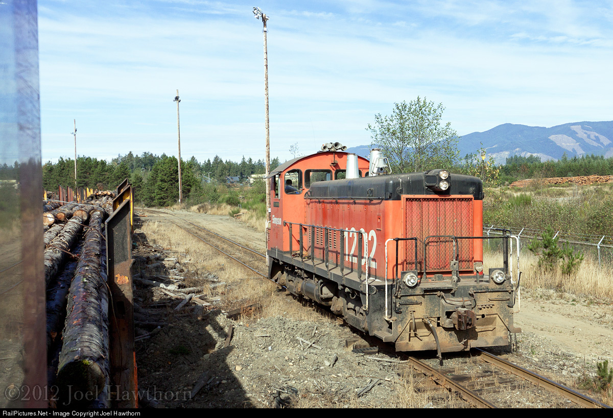 | And the wait begins...after a trip up the hill shoving at the rear of this log train, Jerry situates the 1202 on the main while logs are removed from the loaded train parked on the pass. It may take a while until the chore is completed and the train is released for the trip back to town. The hill off in the distance is part of 3040' South Mountain at the edge of the Olympic Mountain range. |