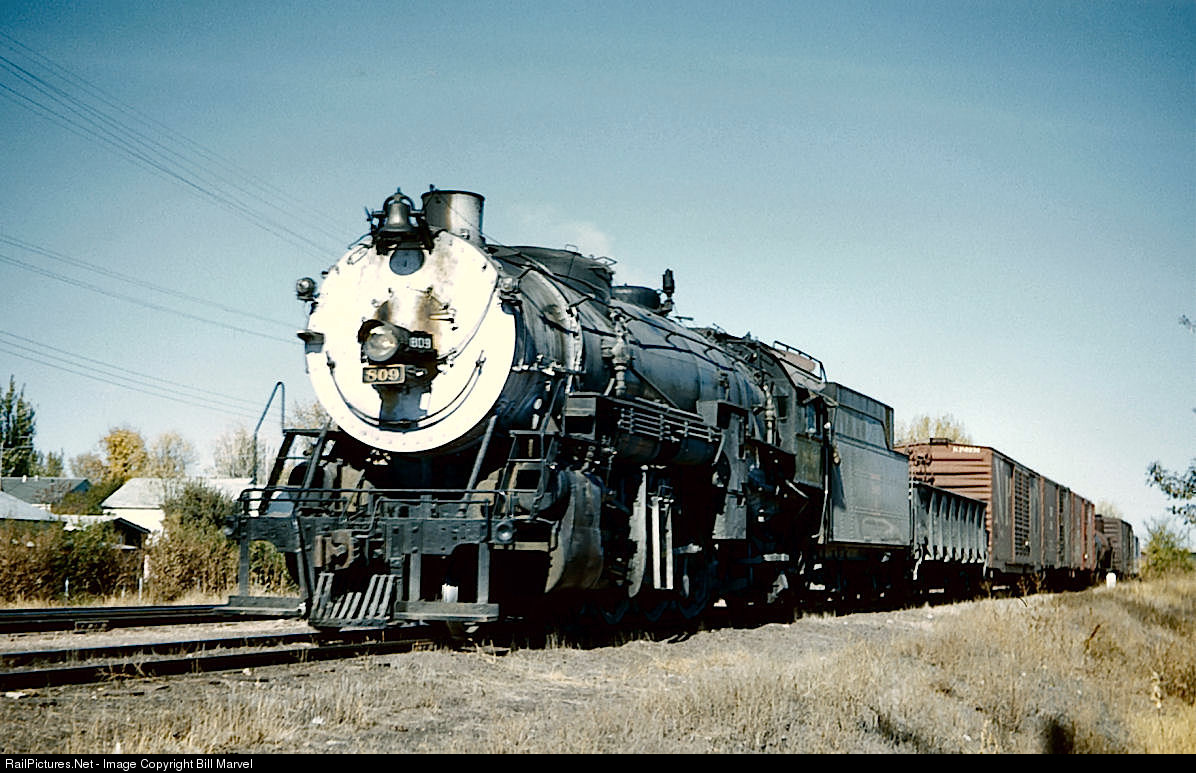 Colorado & Southern 809 is rolling into Loveland with the local from Ft. Collins on a pleasantly warm November afternoon, 1958. The heavy U.S.R.A. 2-8-2 was, until recently, Chicago Burlington & Quincy O-4 5513, but two major wrecks have left C&S short of diesels for the annual sugar beet rush and heavy seasonal traffic in northern Colorado. And so to the delight of photographers, Burlington has sold four of these handsome 1919-built Baldwins to its Colorado subsidiary, where they will find work for a season or two.