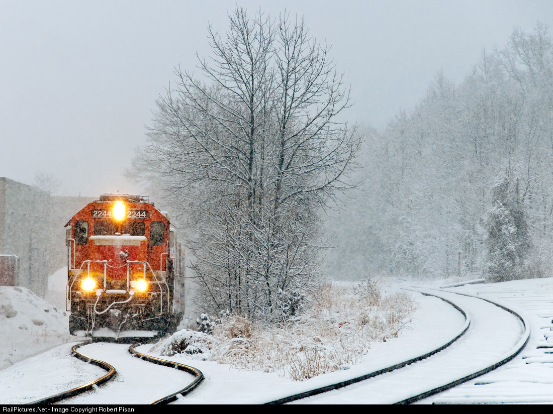 The Raritan Central is busy on this snowy morning with two crews on duty. This crew uses leased former BNSF GP38 2244 to shove a few loads of lumber down a lead where they will be spotted for unloading.