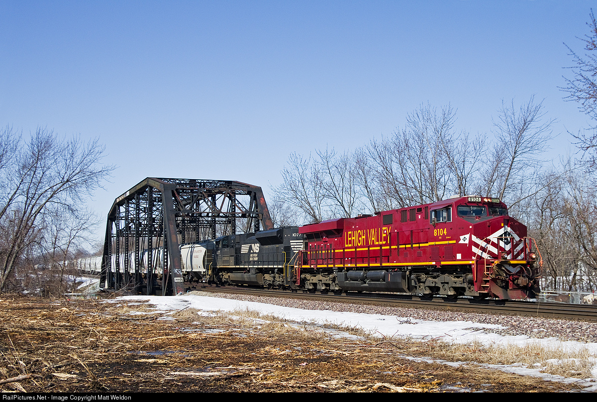 | An extra NS 306 led by the Lehigh Valley heritage unit rolls into Fort Wayne crossing the St. Marys River bridge. A wide angle shot wasn't possible here two weeks earlier when the railroad cut down all the trees and brush. |