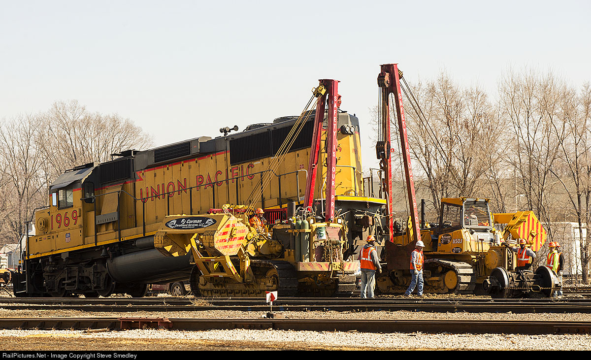 Crews from RJ Corman Derailment Services of Caseyville use two side boom tractors to lift a locomotive so a bad traction motor wheelset can be removed, at Union Pacific Railroad yards off West Chestnut Street in Bloomington, Wednesday, March 11, 2015. An idler wheel set was then put into place so the locomotive can be moved to a shop for repair. Steve Smedley photo