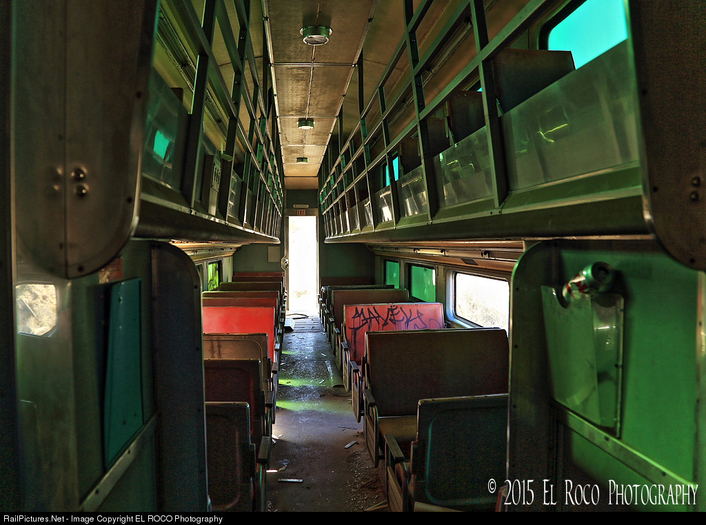 Inside View of METX 7773 at Dubbers Spur - On Dubbers Spur there sits a set of five (5) former Chicago Northwestern (CNW) commuter cars that were acquired by Chicago Metra (METX) and later sold as surplus lies derailed across the turnout at Dubbers Spur on the Carrizo Gorge Desert Line.