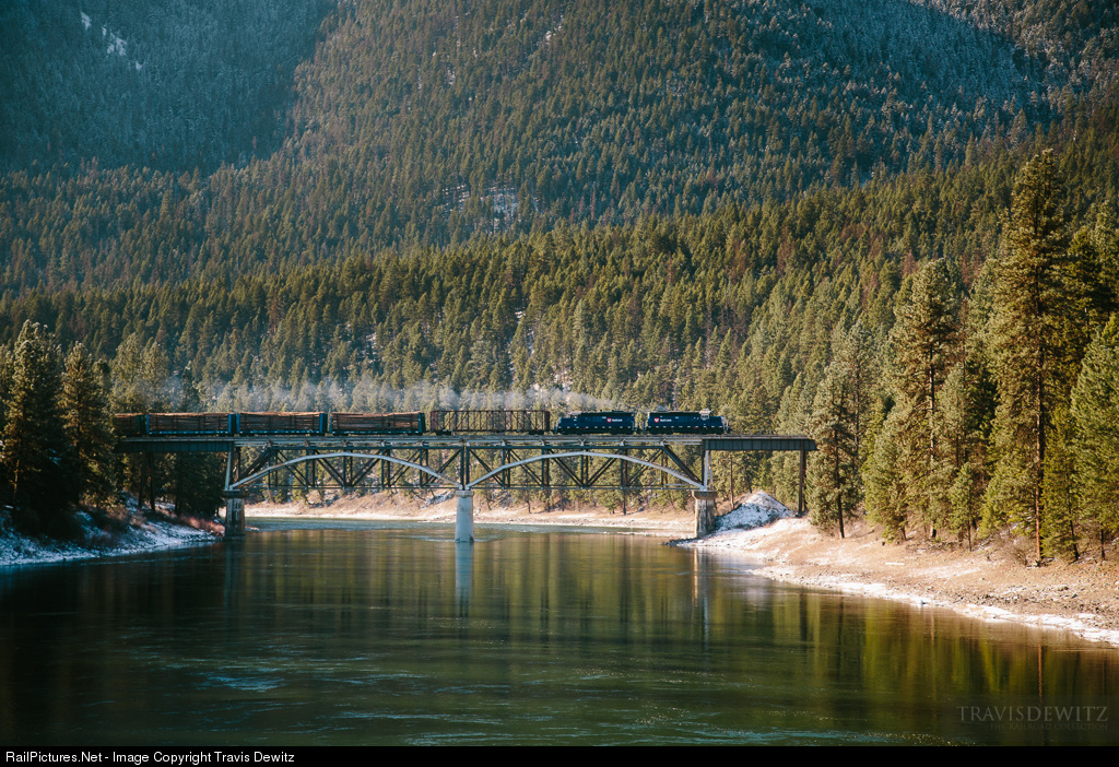 | A pair of Montana Rail Link GP9s on the Paradise Local make time across the Clark Fork spewing exhaust and loaded with logs for Tricon Timber in St. Regis. The drive from Paradise to St. Regis really feels all down hill to me everytime I drive it but in actuality the Clark Fork flows from St. Regis towards Paradise and is a fairly level route. |