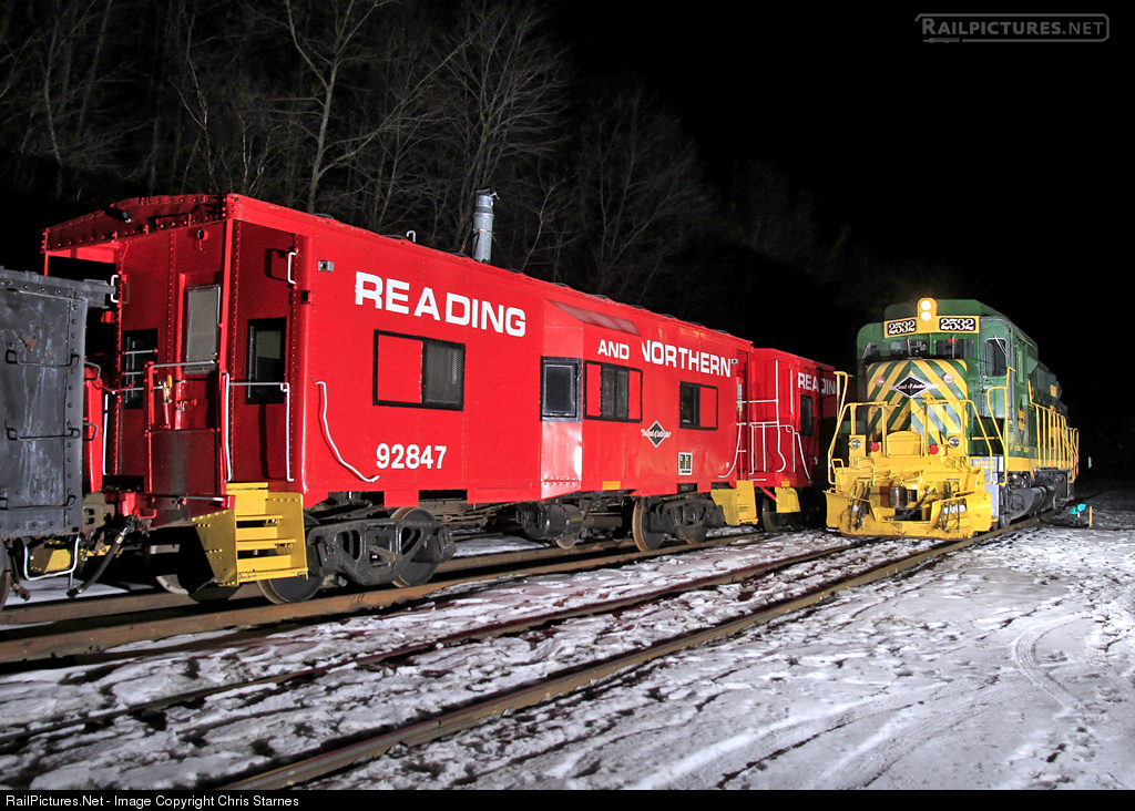 | After bringing the Reading Turn back north to Tamaqua R&N 2532 rests beside the railroad's pair of recently painted bay window cabooses. The caboose in the foreground is former Erie-Lackawanna and the other is former Southern Railway. These two cabs are used for shoving movements on the various jobs that work on the branches around the Tamaqua area. Thanks to engineer Jeff Knadler and conductor Carter Jones for the help with this scene. |