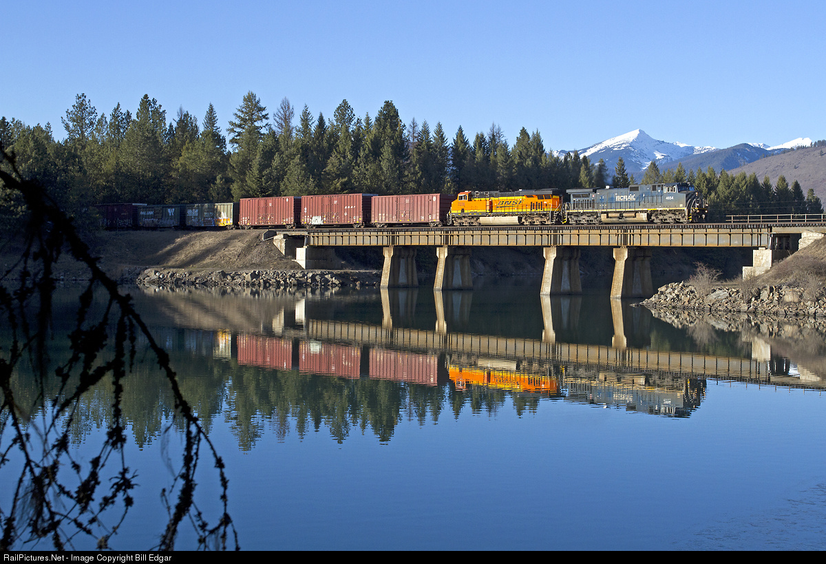 | Former British Columbia Railway C44-9W n0. 4654 leads a BNSF Gevo on a eastbound Pasco-Laurel manifest on Montana Rail Link the afternoon of February 22. Looking much more like late March than winter, the train reflects on itself in the open water at Trout Creek, MT. |