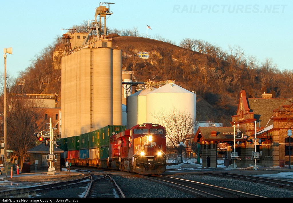 During the last minutes of sunlight, the "hotshot" 199 screams through Red Wing past the depot, heading for Shoreham yard, before continuing its journey west. Check out the Swedish flag painted on the bluff, and the American flag flying above it. Taken while off duty, wearing full PPE.