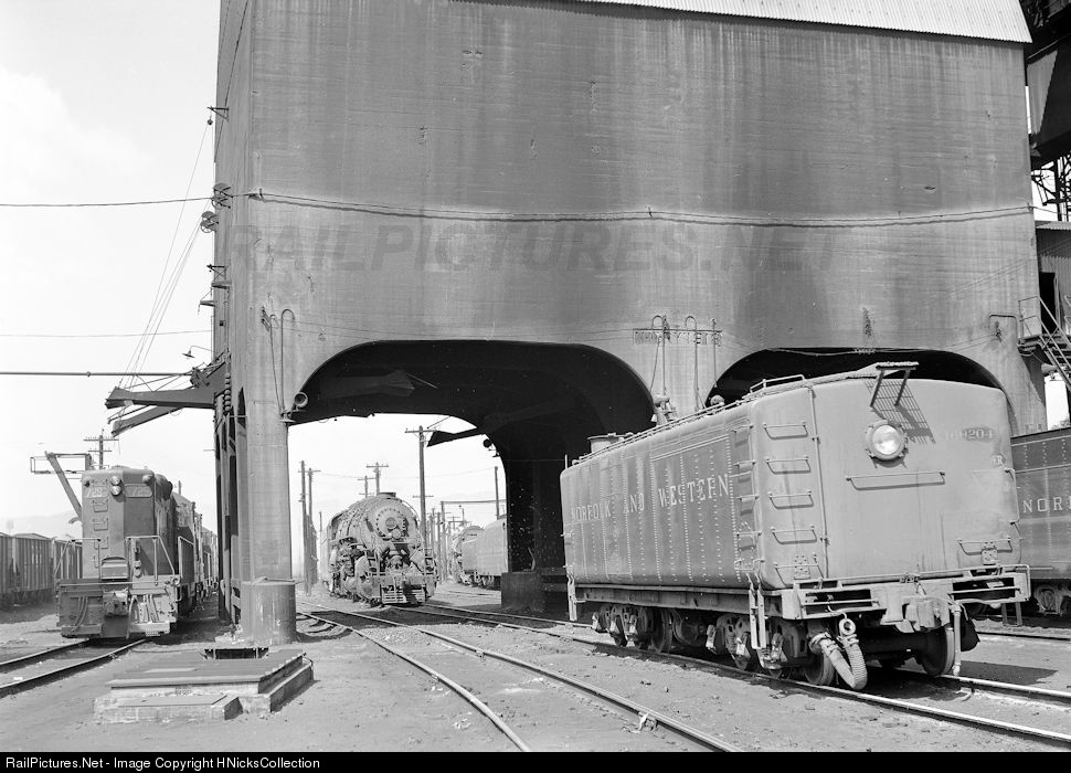 Norfolk and Western Y6b is Preparing to take on coal at Shaffer's Crossing. GP9 #729 is sitting on the opposite track.