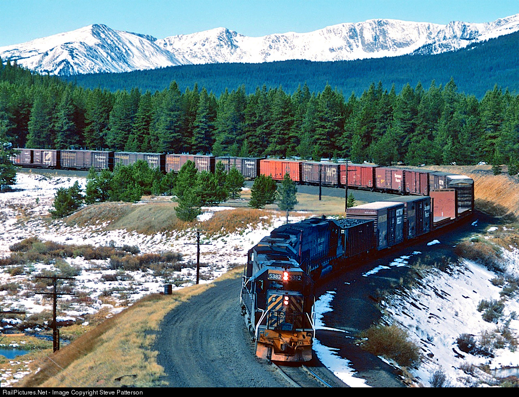 | The rear of D&RGW 5382’s westbound train is still in the Continental Divide and Tennessee Pass summit tunnel as the train now begins its 3% decline at Mitchell, Colo. The train will drop almost 2400-ft. in the next 20 miles for the crews to change at Minturn on Sept. 27, 1985. U.P. closed the route on Aug. 23, 1997. |