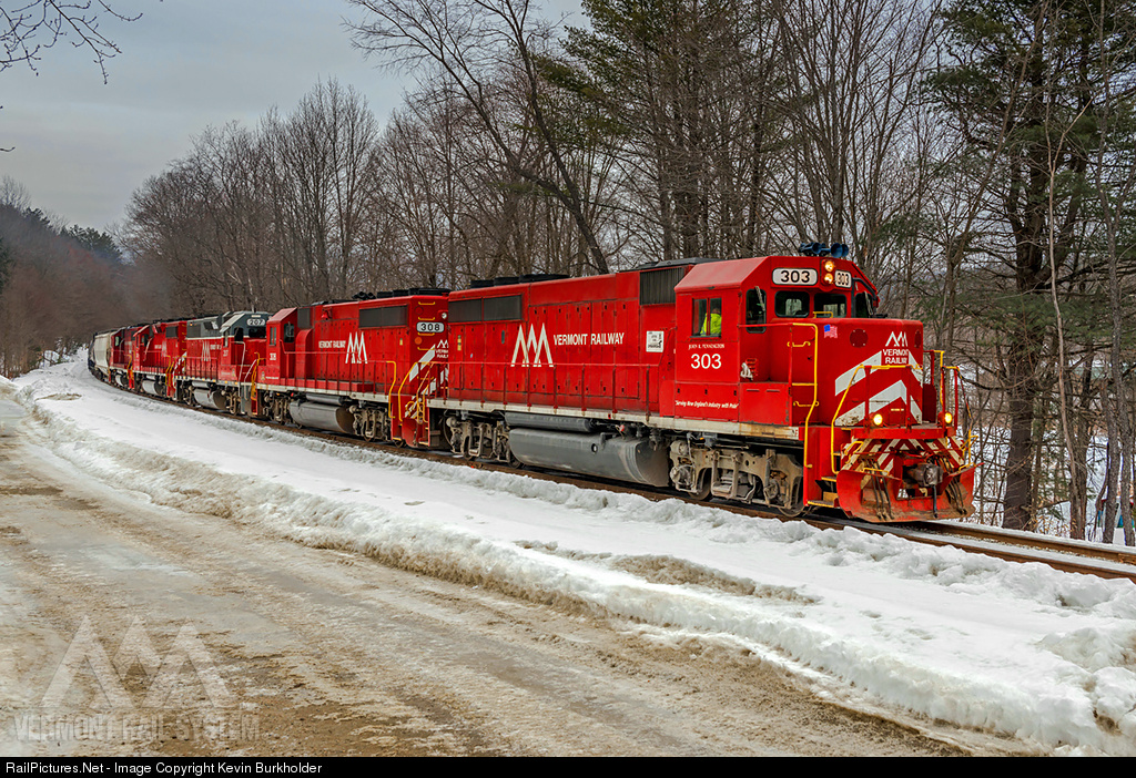The second half - 45 cars - of Vermont Rail System's first 100-car ethanol train is moved through Smithville, Vermont, on Saturday, March 14, with all of the VRS GP40-2 fleet and a lone GP38-3 tucked in for good measure. VTR's (ex-B&M) GP40-2s 303 and 308 lead GP38-3 207, GP40-2 307 and CLP GP40-2 306 as the train heads downgrade toward Ludlow. Lighting from a quartet of Alien Bees at 11:00 am during light freezing rain.