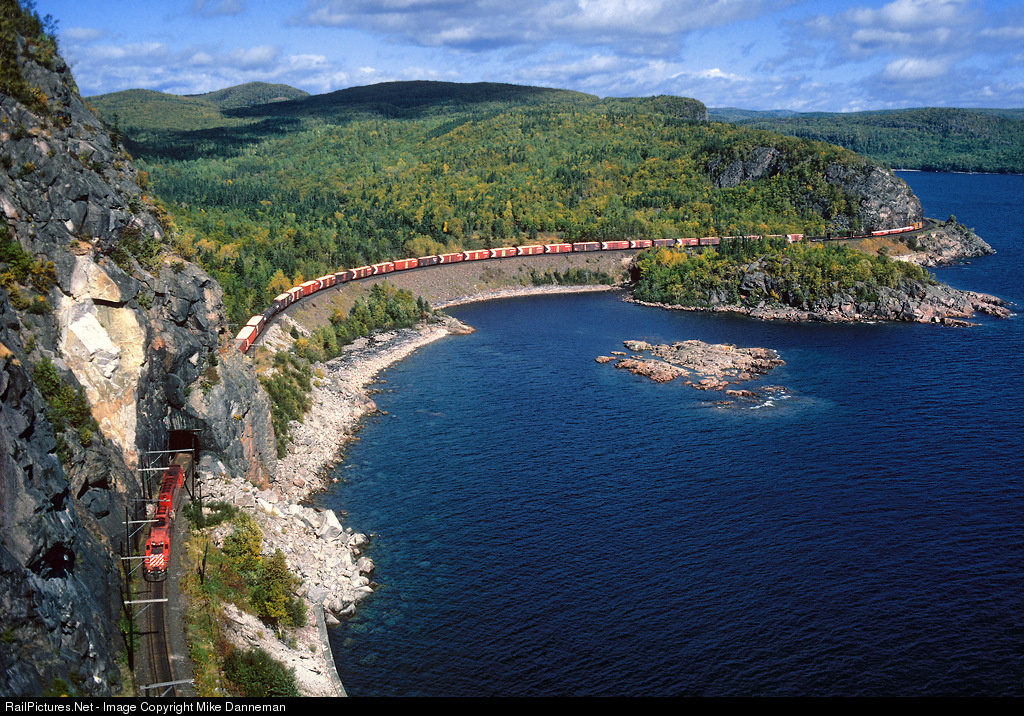 In a view from a precarious perch high above the rugged shores of Lake Superior, Canadian Pacific train No. 935 curves through Mink Tunnel near Coldwell, Ontario, on September 23, 1993. The consist of 935 today is made up of mostly converted 40 and 50-foot boxcars carrying wood chips.