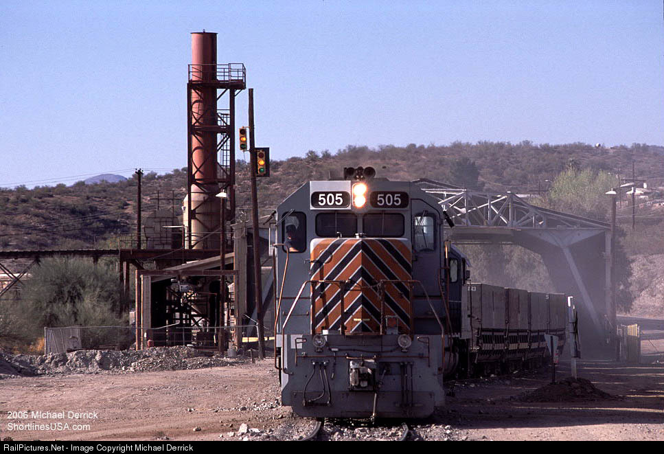 | My trip to the Copper Basin still ranks among my best trips. A guided tour of the operation with the CEO without any prior arrangements speaks loudly of treatment visitors receive, if following the protocol of seeking permission before entering company property. The ore unloading process at Hayden is a very interesting part of daily operations on this shortline, as an ASARCO employee pulls manual dump handles on each car as they roll through the dump house. Dust from the copper concentrate flies as OT-1 eases the train along, under the guidance of the traffic signals. |