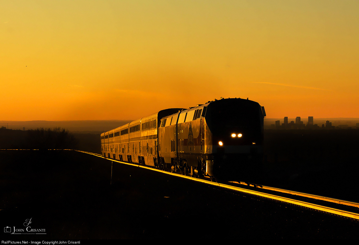 It's just after sunrise as the westbound Ski Train races west through Chemical, Colo., with Amtrak P42DC no. 42, the Veterans unit, on point. Downtown Denver can be seen to the right of the train.