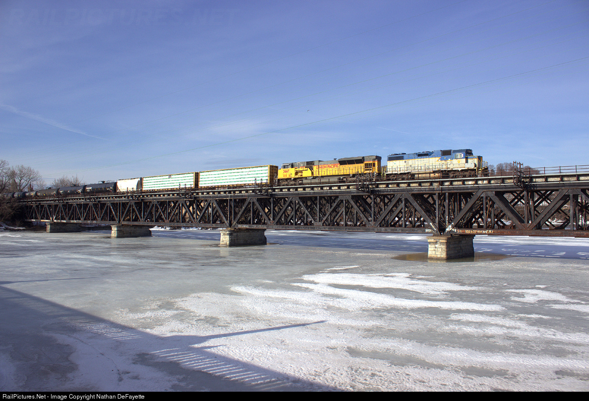 D45 rolls across the Mohawk river with D&H GP38-2 7304 and UP SD9043MAC 3667 on the Kenwood to Saratoga local.