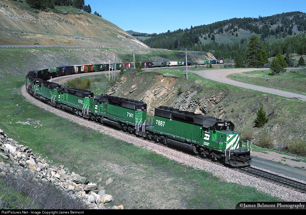 | Happy St. Patrick's Day from the state of Montana and the Burlington Northern Railroad! Seven Cascade Green EMDs lead a mixed freight through Trail Creek on Bozeman Pass the afternoon of May 25, 1986. |