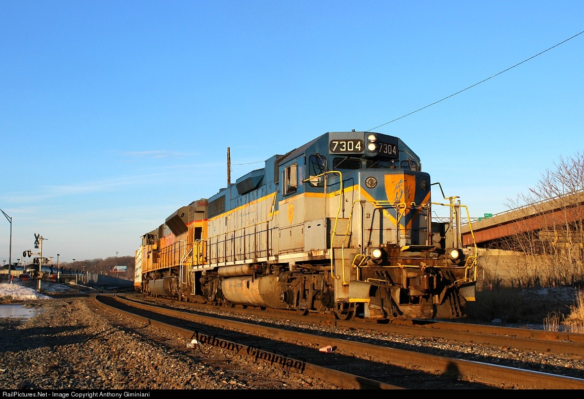 | The CP D45 Local turn is preparing to shove back at Canadian Pacific's Kenwood Yard in Downtown Albany with one of the last two D&H Lighting Stripe GP38-2s on the point. Here the DH 7304 idles in the rising sun. |